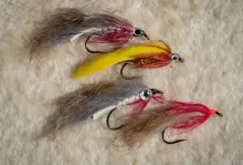 approaches to retrieving this fly, and I have found success with both depending upon conditions. When the fish are fairly active, a single hand strip retrieve is best. Let the activity level of the fish dictate how long and fast each strip should be, and how long you should pause between strips to let the fly sink a bit. When the fish are less active or just plain neutral, a slow two handed retrieve can trigger strikes by steadily pulling the fly through the water just fast enough to make the rabbit hairs and strips shimmy.